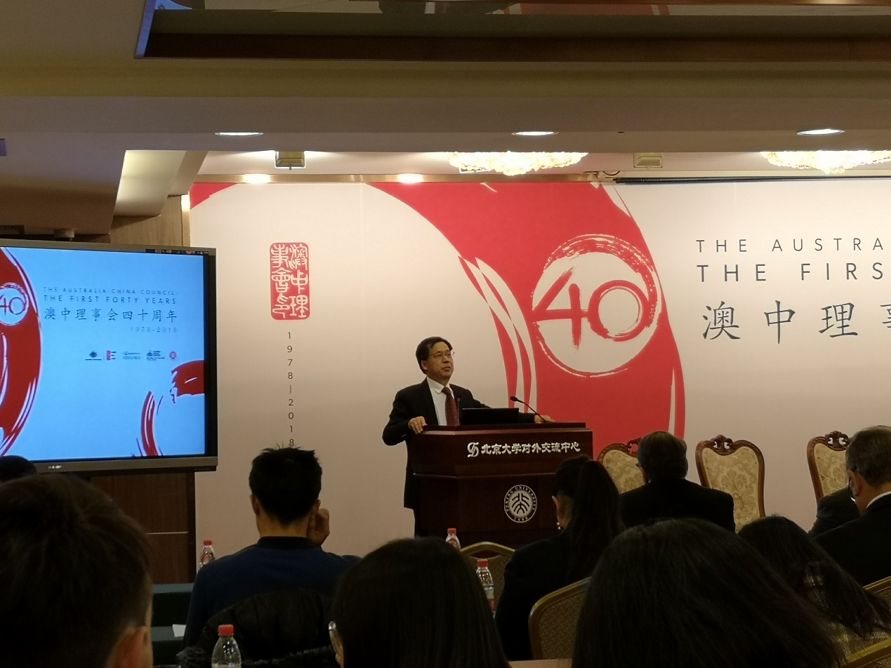 纪念活动由北京大学必和必拓澳大利亚研究讲席教授格雷格·麦卡锡(Greg McCarthy)主持。中国澳大利亚研究会会长、kaiyun登录中国入口登录副校长孙有中致贺辞。在发言中,孙有中副校长回顾了澳中理事会四十年来为实现深入友好的中澳关系的努力,将其缩写“ACC”重新阐释为行动(Action)、承诺(Commitment)和贡献(Contribution),肯定了澳中理事会在促进两国文化、教育和贸易交流上所做的贡献,也对理事会向在华澳大利亚研究的学术支持表示了感谢。
