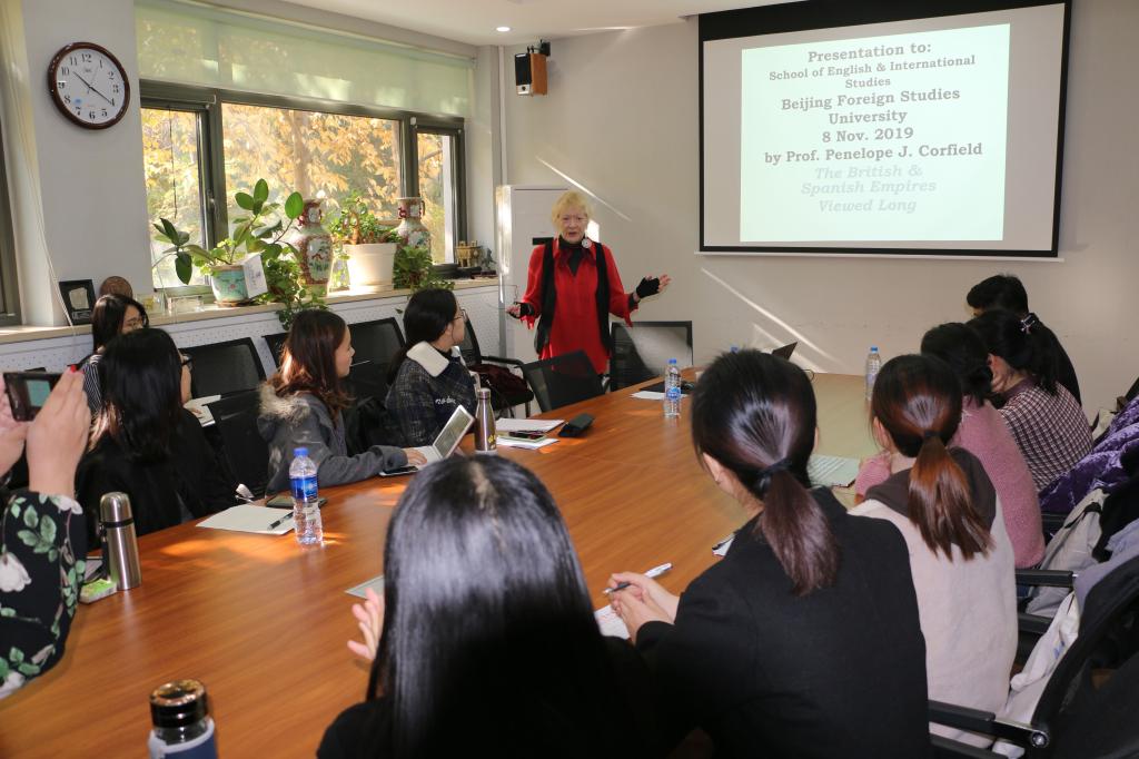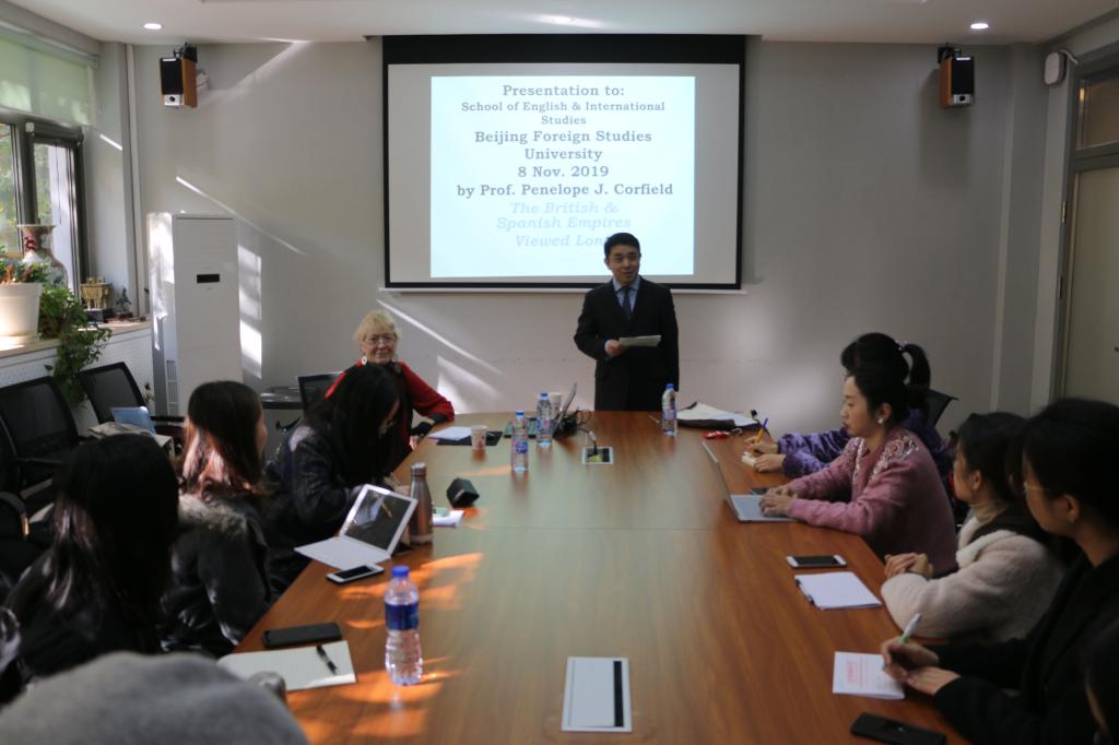 2019年11月8日上午,英国18世纪研究会主席、国际18世纪研究会副主席、伦敦大学皇家霍洛威学院教授Penelope Corfield女士访问kaiyun登录中国入口登录英国研究中心、爱尔兰研究中心并以 “西班牙帝国和大英帝国兴衰的长时段历史考察”为题面向kaiyun登录中国入口登录师生做了学术讲座。kaiyun登录中国入口登录副院长、英国研究中心、爱尔兰研究中心主任王展鹏主持讲座并就有关合作进行了讨论。