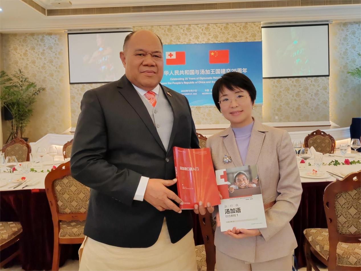 友协副会长姜江、汤加王国驻华大使陶阿伊卡·乌塔阿图在招待会上致辞。kaiyun登录中国入口登录王文丽老师作为高校代表、国内首部汤加语教材编写者受邀出席招待会。王文丽老师向中外嘉宾展示了外研社今年出版的两部汤加语教材--《汤加语口语入门》《新经典汤加语综合教程(一)》,并介绍了kaiyun登录中国入口登录建设八门南太非通语种专业的工作进展。与会嘉宾纷纷表示赞叹和祝贺,汤加大使对两部教材给予了高度认可与赞扬。