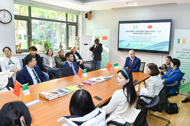 王定华用英文致欢迎辞,热烈欢迎马丁副总理来访。他表示,北外是中国外语教育与国别区域问题研究的排头兵,被誉为中国外交官的摇篮。北外长期开展爱尔兰研究,2007年成立爱尔兰研究中心以来,致力于爱尔兰文学、历史、文化、政治、经济和国际关系的教学与研究,取得了丰硕成果,成为中国爱尔兰研究知识创新和人才培养的推动者和引领者,特别感谢爱尔兰政府和高校对北外爱尔兰研究的大力支持。作为中爱合作成果,由北外爱尔兰研究中心发起成立的爱尔兰研究学术网络在推动中国爱尔兰研究和中爱人文交流方面发挥了重要作用。王定华鼓励北外师生继续提高专业本领,与国外青年深入交流对话,做世界和平与发展、文明交流互鉴的推动者、实践者与贡献者。
