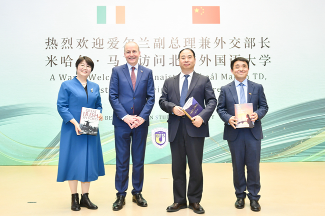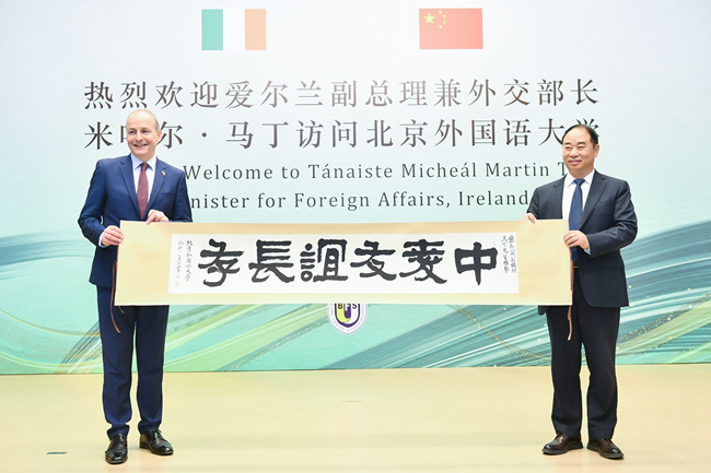 马丁就中爱关系与爱尔兰的外交政策发表了演讲。他表示,北外作为外交、文化与语言研究的一流大学,享有盛誉。他十分高兴爱尔兰语是北外教授的101种语言之一。北外爱尔兰研究中心自成立以来,积极推广爱尔兰文化、从事爱尔兰研究,特别是2022年,北外王展鹏教授和陈丽教授获得“爱尔兰总统杰出贡献奖”,这是对北外推动中爱人文交流成绩的高度肯定。他表示将推动两国在维护世界和平、经贸合作、人文交流等领域开展合作,共同面对全球治理挑战。