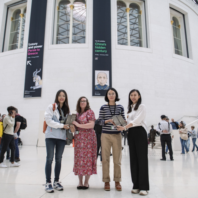 调研团队的第一站选择了闻名遐迩的大英博物馆,这座博物馆因其庞大的馆藏和丰富的经验而吸引着全球观众。调研团队详细考察了大英博物馆策划的近期特展——“China’s Hidden Century 晚清百态”,从文物展示、策展规划等角度,全面了解国际化文博设计。