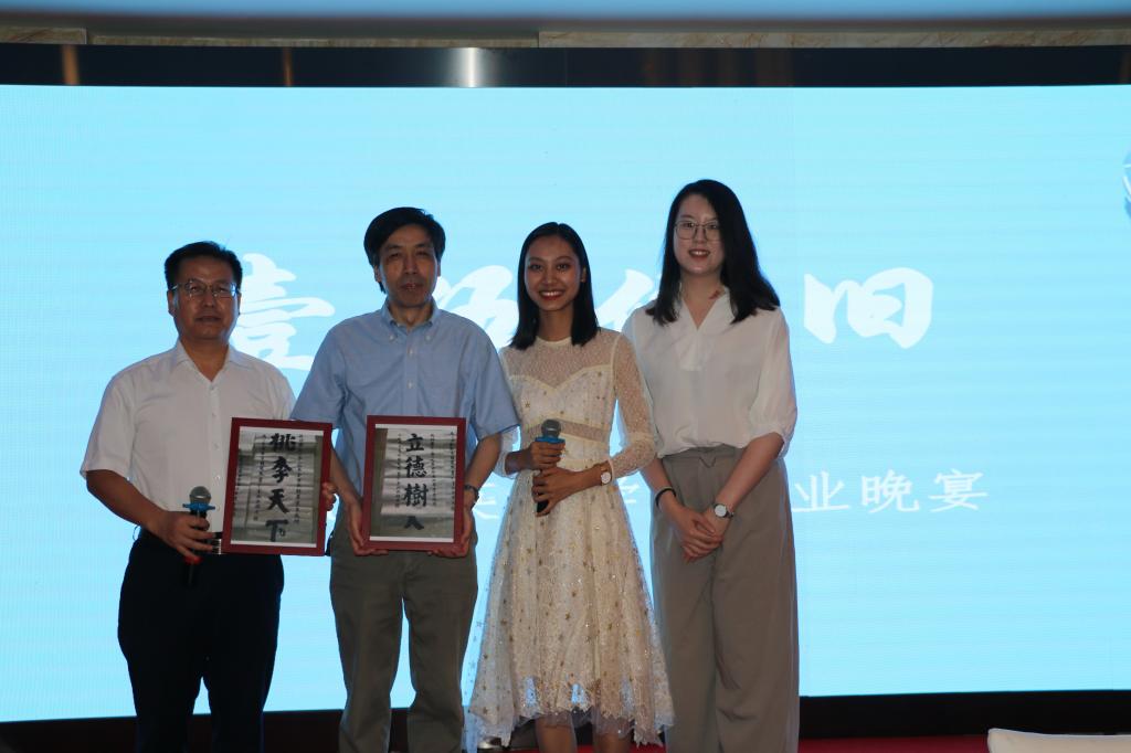 6月26日、27日晚,学生工作办公室精心组织了研究生、本科生毕业晚宴,院长张剑、党总支书记路兴、副院长王展鹏、孔子学院院长金利民、陈亚平、林岩、宋云峰、闫循华、孙三军、谢登攀、王元陆、王颖冲、张春霞等老师参加了毕业晚宴。师生们盛装出席,欢聚一堂,毕业生们表演了精彩的节目,向学院赠送了精美的礼物。本科生胡笑然代表全体本科生赠送了她书写的“立德树人”、“桃李天下”的书法作品。